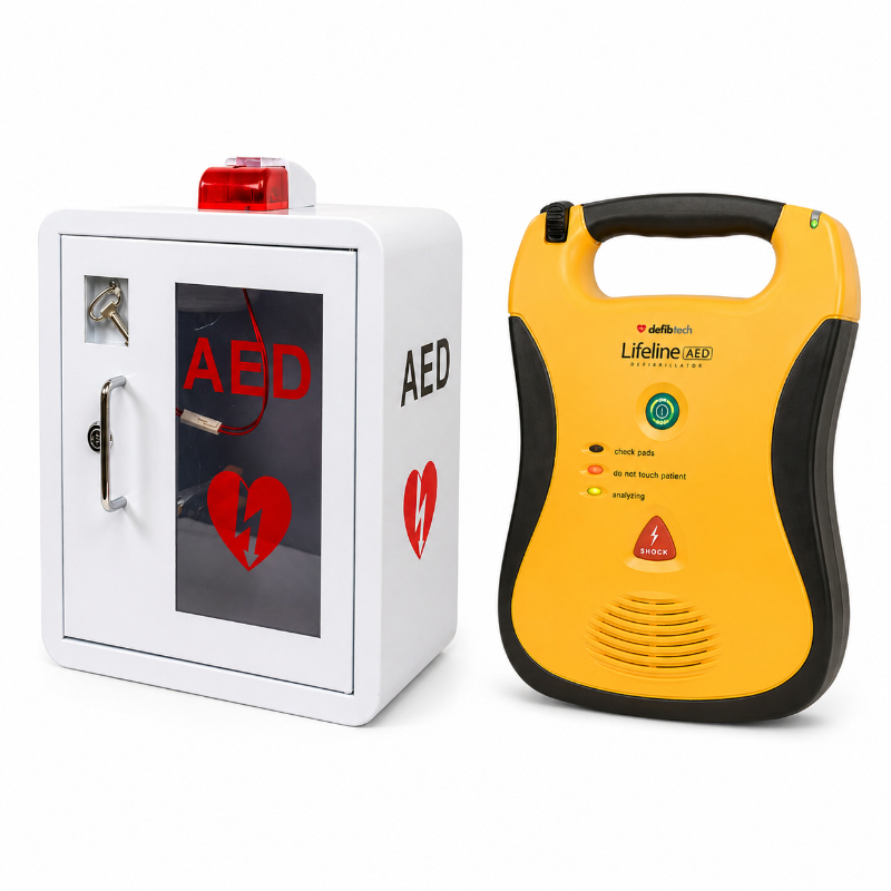 חבילת באנדל מקצועית הכוללת דפיברילטור לייף ליין Lifeline יחד עם ארון אחסון ייעודי למכשירי AED. פתרון מלא, נוח ומוכן להצבה במשרד, מוסד, עסק, בית כנסת, חדר כושר, קליניקה או מבנה ציבורי. המכשיר מיועד למתן מענה ראשוני במקרי חירום לבביים, והארון מאפשר אחסון מסודר, נגיש ובולט לעין.
